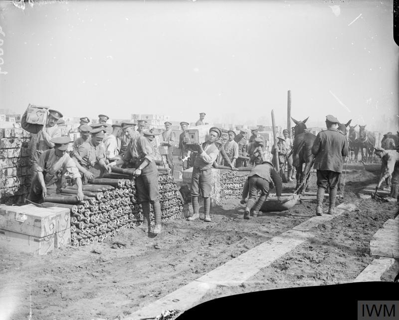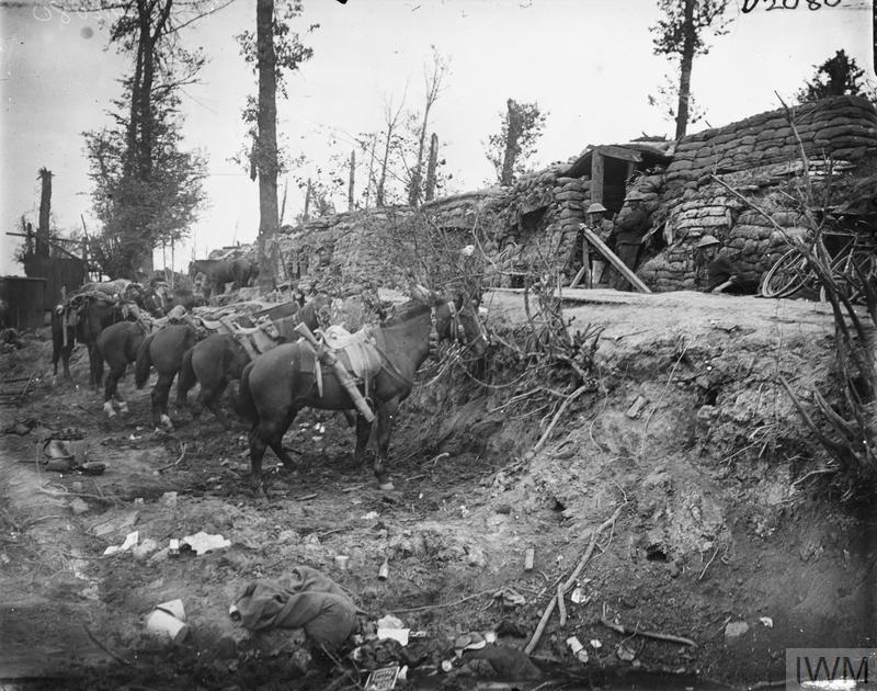 Horse transport moving along the camouflaged Menin Road, Ypres