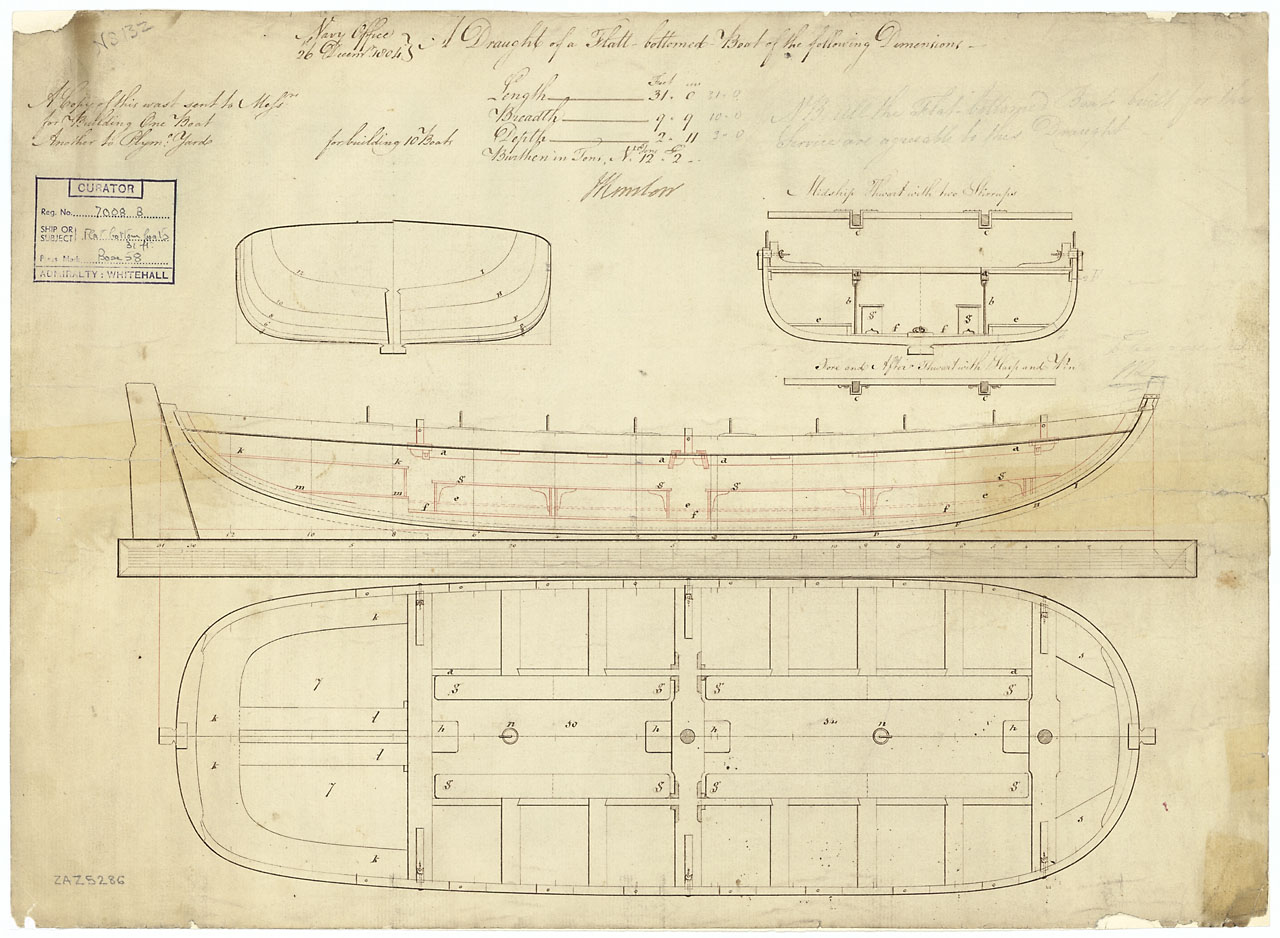 31ft Flat-bottomed Boat (1804). Scale: 1:24. Plan showing the body plan, midship section, inboard profile, and deck plan for a 16-oared, 31ft Flat-bottomed Boat (1804).