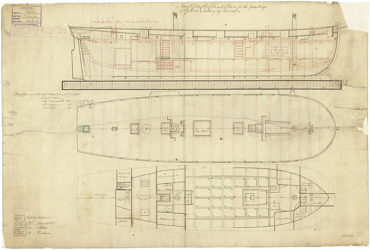 Archer class (1800) of 58 12-gun Gunbrigs. Scale: 1:48. Plan showing the inboard profile, upper deck, and lower deck for the 58 ships of the Archer class (1800), 12-gun Gunbrigs built by contract. Reverse is annotated with a list of the builders and the