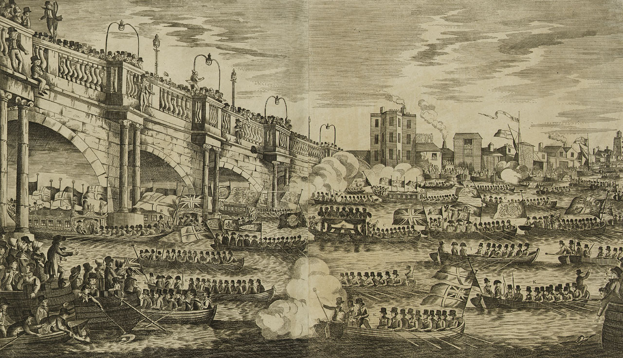 A View of the Funeral Procession by water from Greenwich to Whitehall Stairs Jany. 8 1806 with the body of the great Naval Hero Admiral Lord Nelson etc. Print. A view of the funeral procession by water from Greenwich to Whitehall Stairs. The procession is
