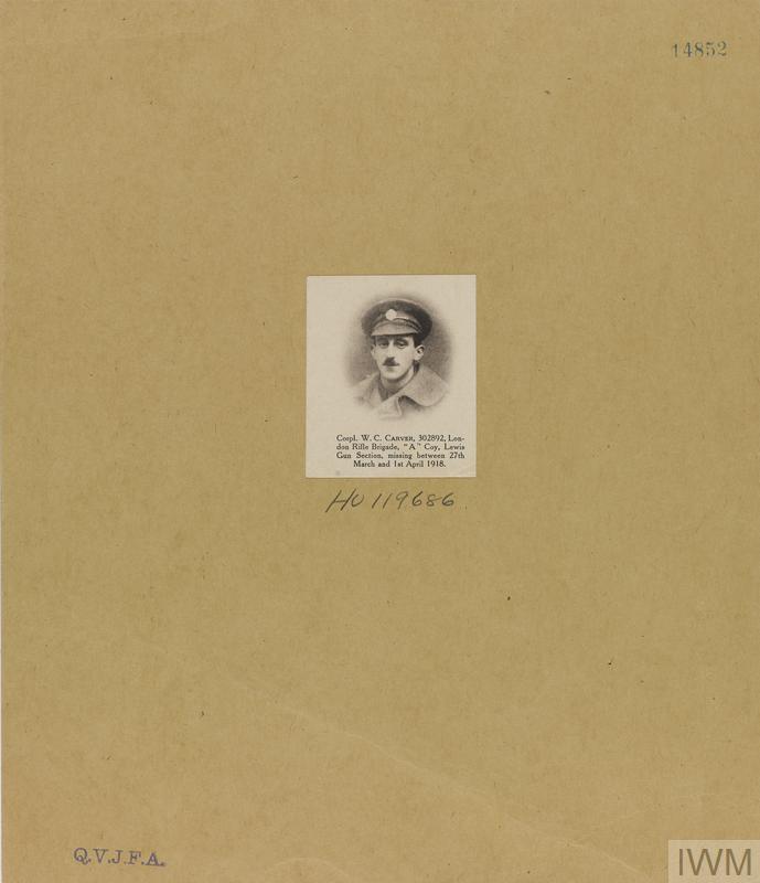 Corporal William C Carver 302892. Unit: Lewis Gun Section, A Company, 5th Battalion, London Regiment (London Rifle Brigade). Death: 27 March 1918 to 01 April 1918 Missing in action