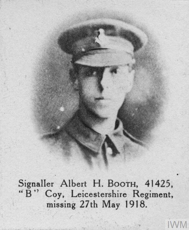 Private (Signaller) Albert H Booth 41425. Unit: B Company, Leicestershire Regiment. Death: 27 May 1918