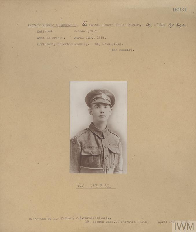 Private Robert W Barneveld 46778/305998. Unit: 5th Battalion, London Regiment (London Rifle Brigade), attached to 2nd Battalion, Rifle Brigade. Death: 27 May 1918