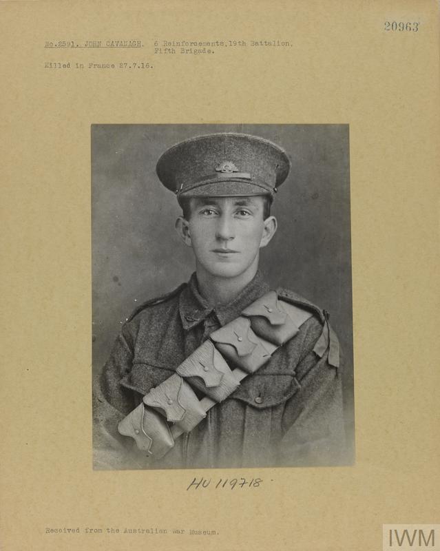 Private John Cavanagh 2591. Unit: 3rd Battalion, Australian Imperial Force. Death: Between 22 and 27 July 1916, killed in action, Western Front. Commemorated on the Villers-Bretonneux Memorial.