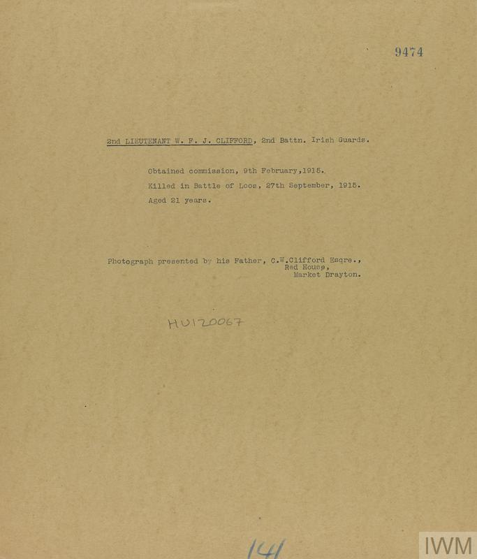 Second Lieutenant Walter Francis Joseph Clifford. Unit: 2nd Battalion, Irish Guards. Death: 27 September 1917 Killed in action near Loos Western Front