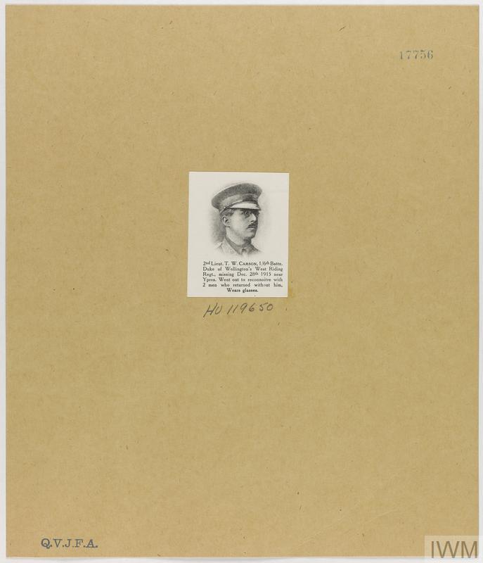 Second Lieutenant Thomas Wright Carson. Unit: 1/6th Battalion, Duke of Wellington's (West Riding Regiment). Death: 27 December 1915 Missing in action near Ypres Western Front