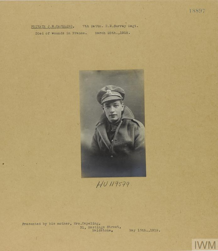 Private James Walter Capeling G/25350. Unit: 7th Battalion, The Queen's (Royal West Surrey Regiment). Death: 28 March 1918 Died of wounds in France Western Front. Son of Mr. and Mrs, H. A. Capeling, of 31, Hartnup St., Maidstone.