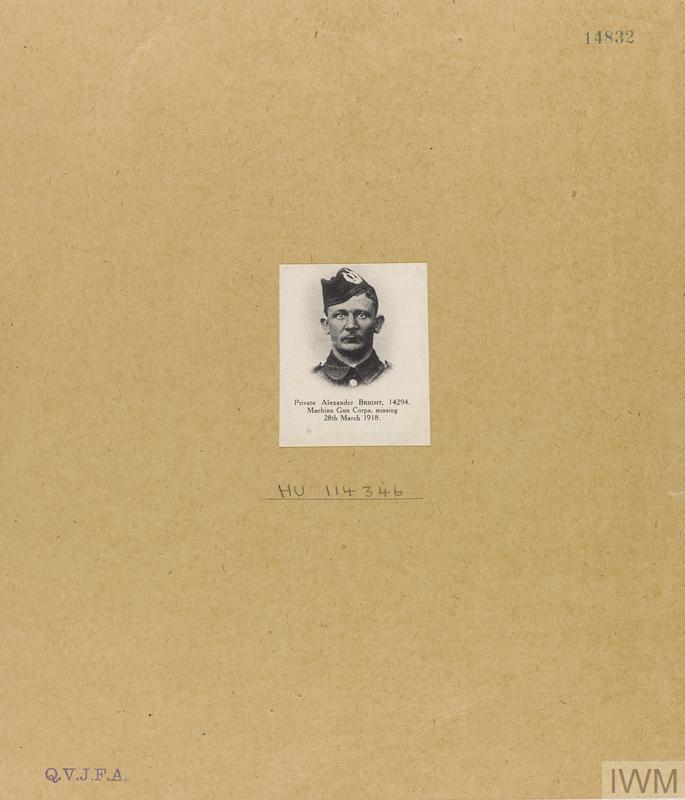 Private Alexander Bright 14294. Unit: 15th Battalion, Machine Gun Corps (Infantry). Death: 28 March 1918 Western Front