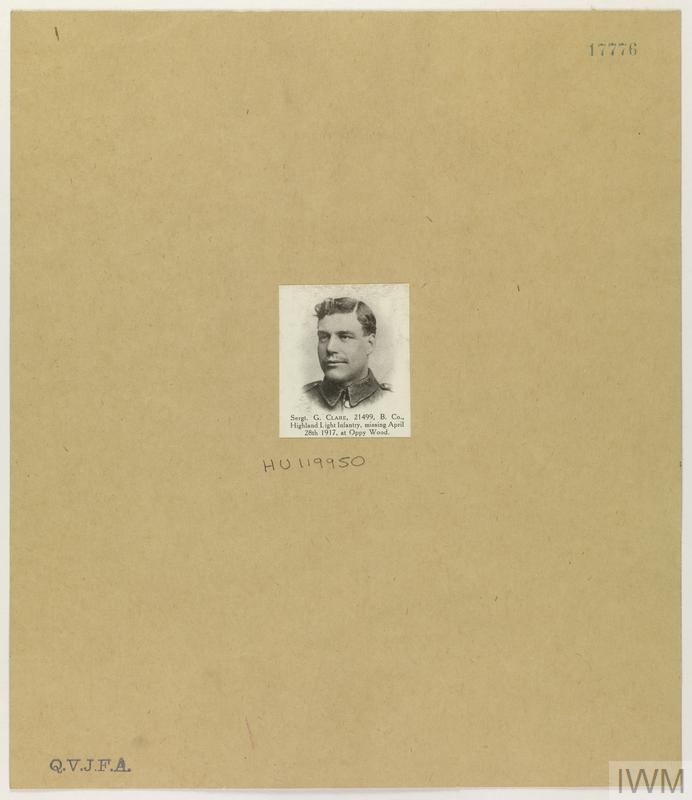 Sergeant George Clare 21499. Unit: B Company, 2nd Battalion, Highland Light Infantry. Death: 28 April 1917 Missing in action at Oppy Wood Western Front