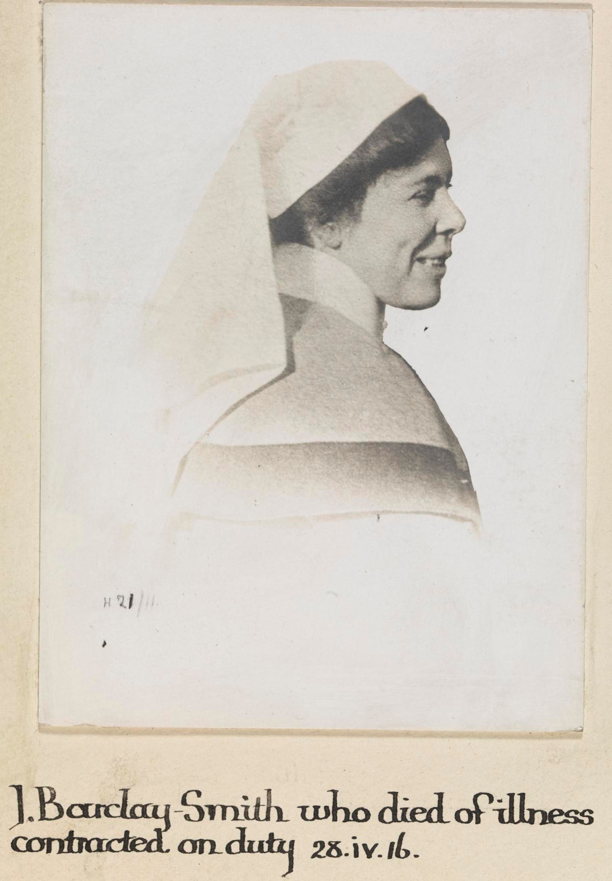 Jeannie Barclay Smith, Queen Alexandra's Imperial Military Nursing Service Reserve. Died of illness contracted on duty 28 April 1916.