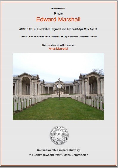 Lance Corporal John Marshall 7941. Unit: 13th Platoon, D Company, 10th Battalion, Lincolnshire Regiment. Death: 28 April 1917 Missing Western Front