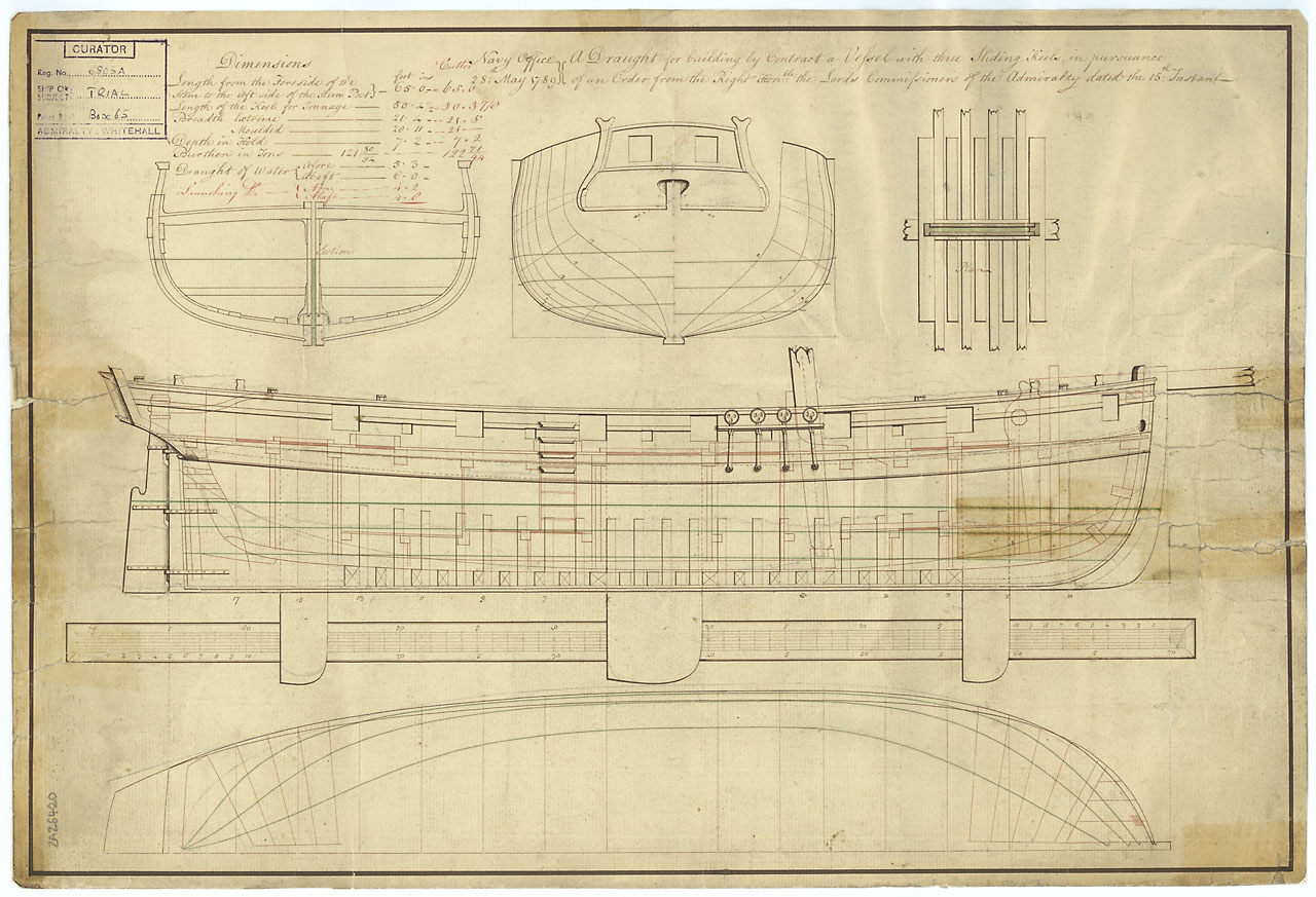 Trial (1790). Scale: 1:48.  Plan showing the body plan with stern board outline, sheer lines with inboard detail, longitudinal half-breadth, and a plan and section through the centreboard casing, proposed and approved for building Trial (1790), an 8-gun s