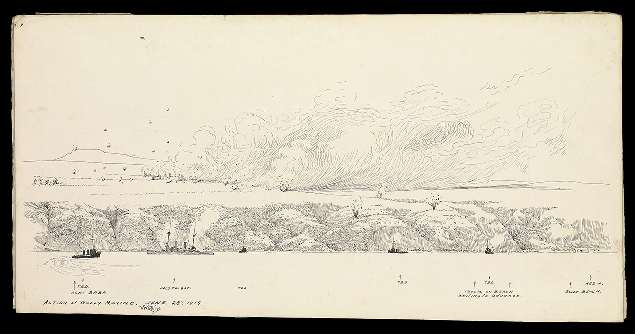Advance of troops up Gully Ravine assisted by War ships June 28/15. No 21 in a series of sketches of the Dardanelles/Gallipoli Campaign 1915. Signed by artist and dated.