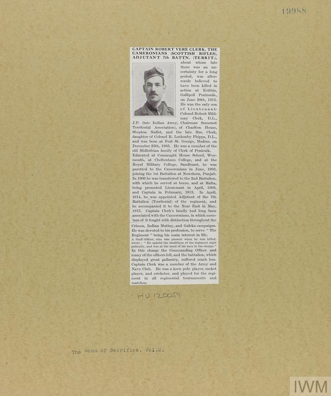 Captain Robert Vere Clerk. Unit: 1st Battalion, attached as Adjutant to 7th Battalion, Cameronians (Scottish Rifles). Death: 28 June 1915 Believed Killed in action at Krithia Gallipoli