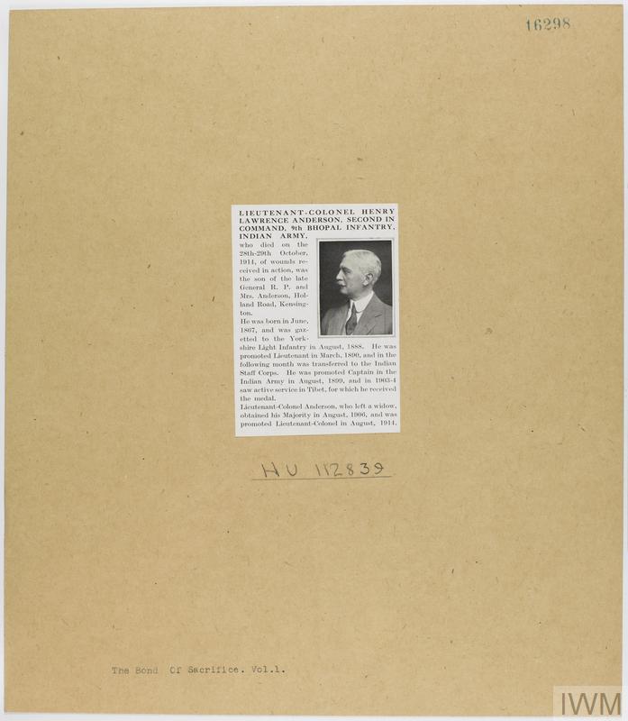 Lieutenant Colonel Henry Lawrence Anderson. Unit: 9th Bhopal Infantry, Indian Army. Death: 28 October 1914