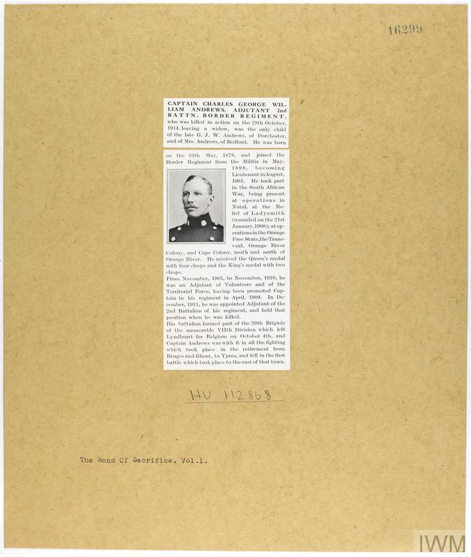 Captain Charles George William Andrews MID. Unit: Adjutant, 2nd Battalion, Border Regiment. Death: 28 October 1914 East of Ypres Western Front