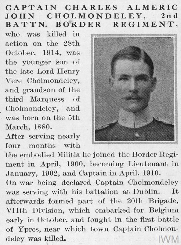 Captain Charles Almeric John Cholmondeley. Unit: 2nd Battalion, Border Regiment. Death: 28 October 1914 Killed in action Aged 34 years Ypres, Western Front. Son of the late Lord and Lady Henry V. Cholmondeley.