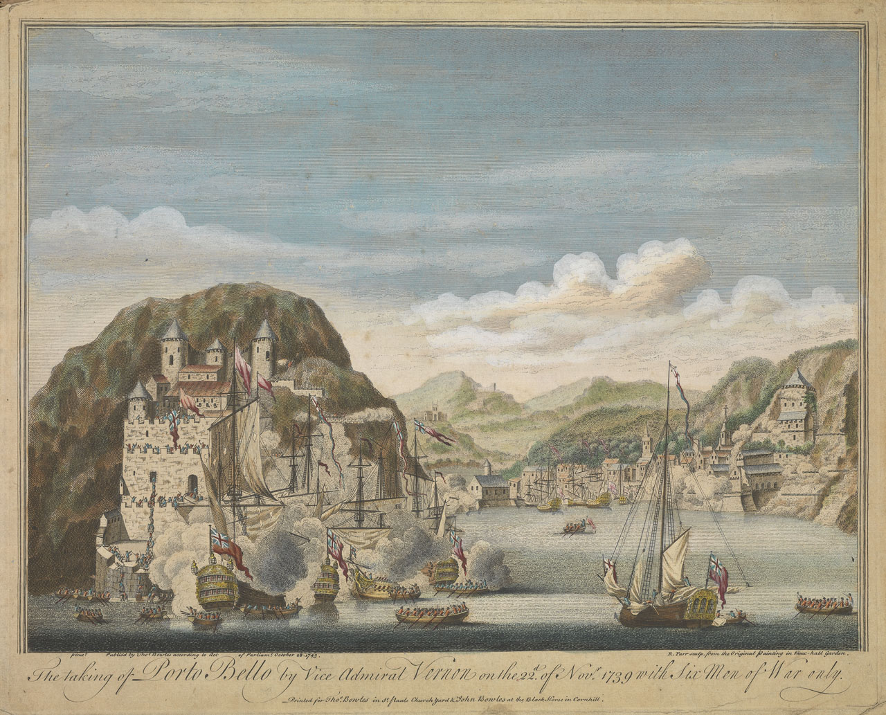 The Taking of Porto Bello by Vice Admiral Vernon on the 22nd.of Novr. 1739 with six Men-of-War only. Hand-coloured.; Heightened with white.