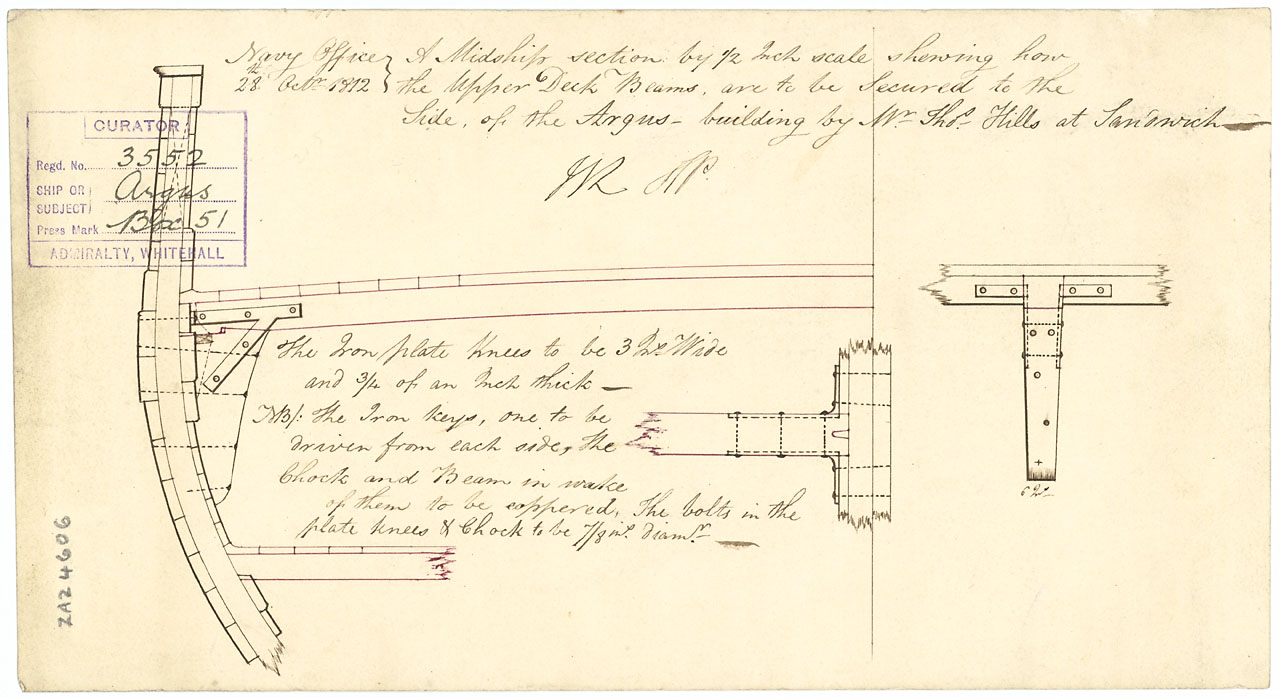 Argus (1813). Scale: 1:24. Plan showing part of the midship section illustrating the method of fixing the upper deck beams to the sides for Argus (1813), an 18-gun Brig [Brigantine] Sloop building at Sandwich by Thomas Hills.