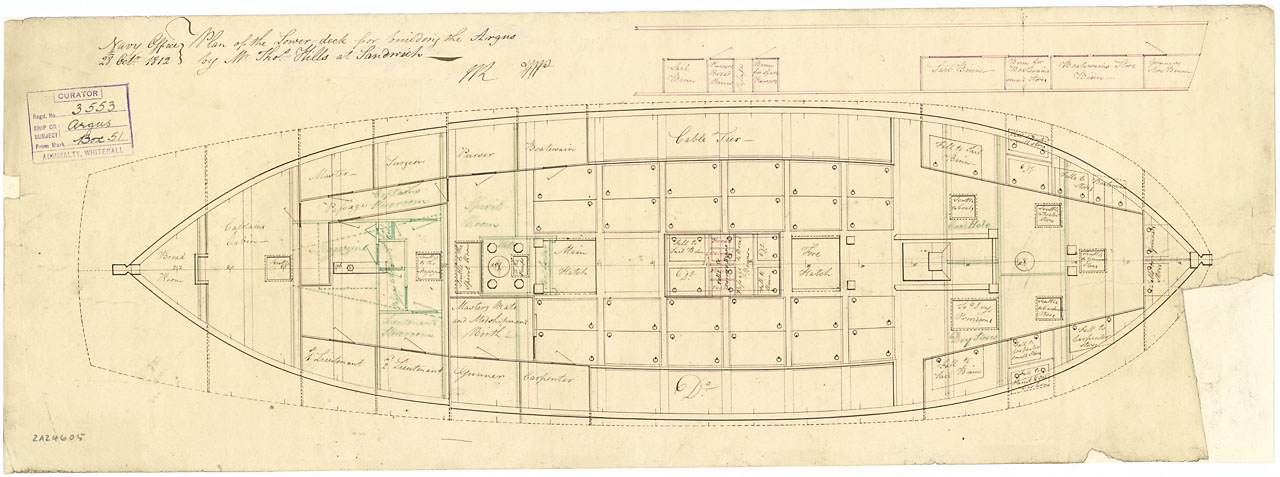 Argus (1813). No scale, probably 1:48. Plan showing the lower deck, with sail, food and storage bin elevations, for Argus (1813), an 18-gun Brig [Brigantine] Sloop at Sandwich by Mr Hills.