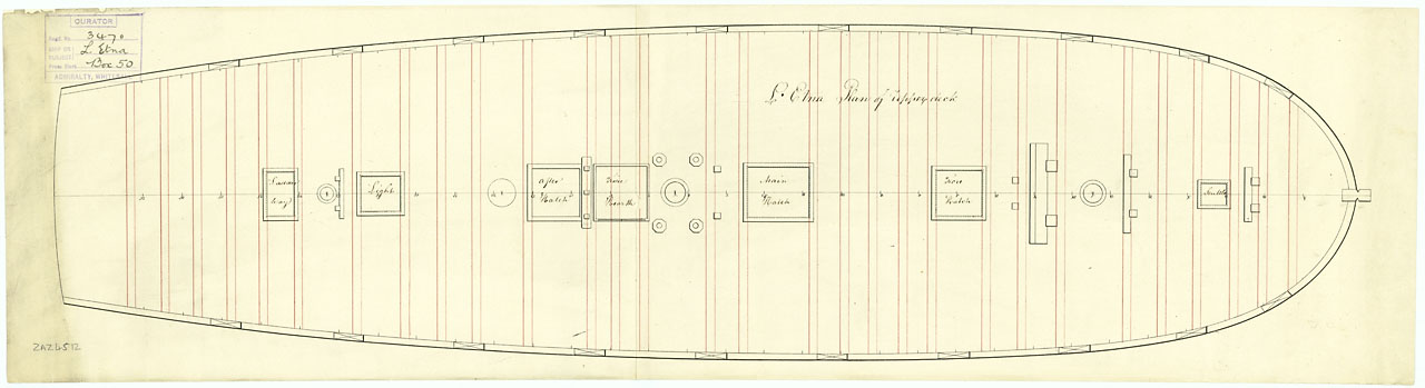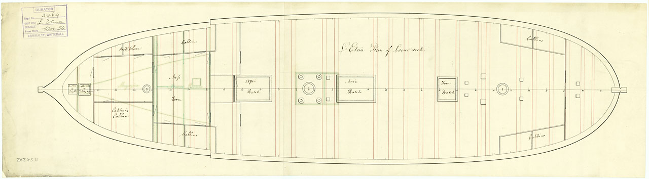 Cormorant (captured 1796). Scale: 1:48. Plan showing the body plan, sheer lines with inboard detail and figurehead, and longitudinal half-breadth for Cormorant (captured 1796), a captured French Corvette, as taken off prior to being fitted as a 20 gun Si