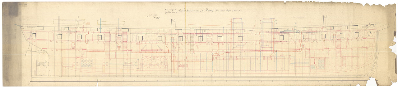 Mersey (1858). Scale: 1:48.  Plan showing the inboard profile for Mersey (1858), a 40-gun screw frigate as taken off at Portsmouth Dockyard a year after completing at Chatham.