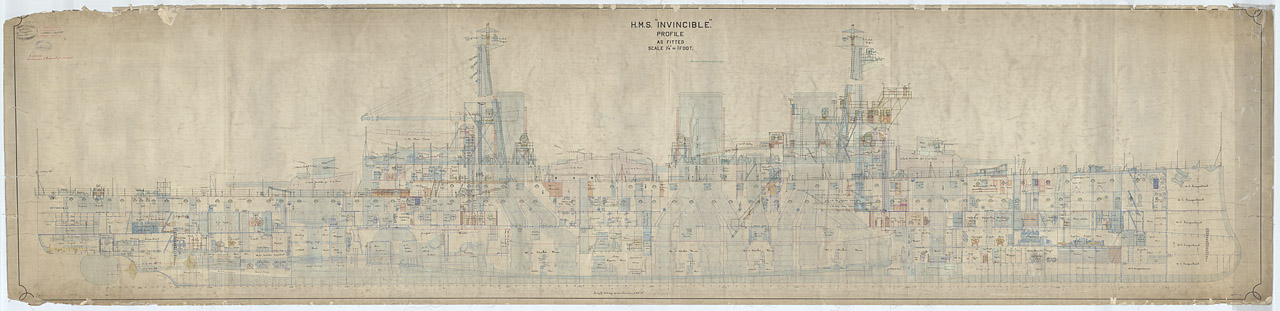 HMS Invincible (1907). Scale 1:48. A plan showing the inboard profile of the battlecruiser HMS Invincible (1907). The drawing shows the ship as completed in 1909, with subsequent alterations up to 1914.