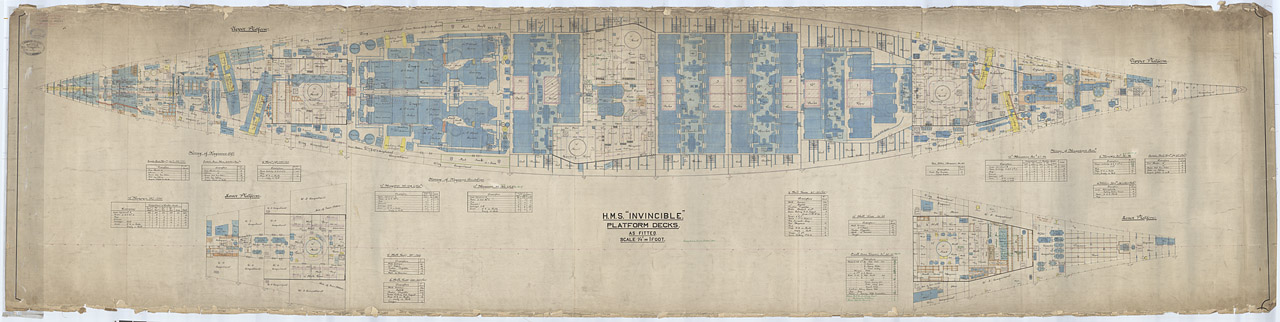 HMS Invincible (1907). Scale 1:48. A plan showing the platform decks of the battlecruiser HMS Invincible (1907). The drawing shows the ship as completed in 1909, with subsequent alterations up to 1914.