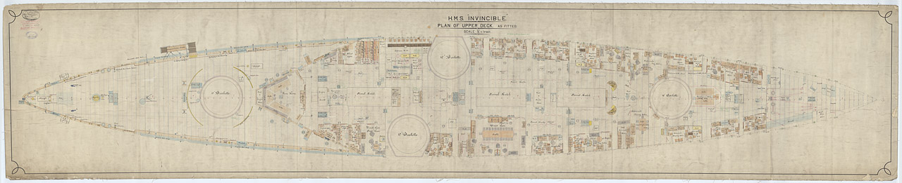 HMS Invincible (1907). Scale 1:48. A plan showing the upper deck of the battlecruiser HMS Invincible (1907). The drawing shows her as completed in 1909, with subsequent alterations up to 1914.