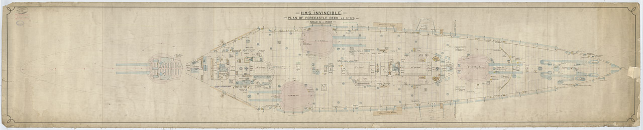 HMS Invincible (1907). Scale 1:48. A plan showing the forecastle deck of the battlecruiser HMS Invincible (1907). The drawing shows her as completed in 1909, with subsequent alterations up to 1914.