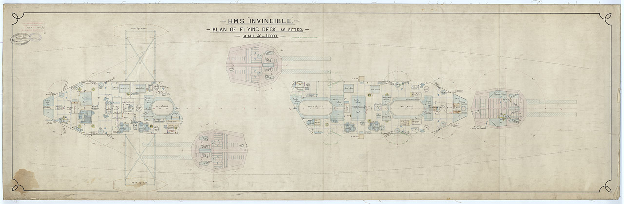 HMS Invincible (1907). Scale 1:48. A plan showing the flying deck [lower superstructure] of the battlecruiser HMS Invincible (1907). The drawing shows her as completed in 1909, with subsequent alterations up to 1914.