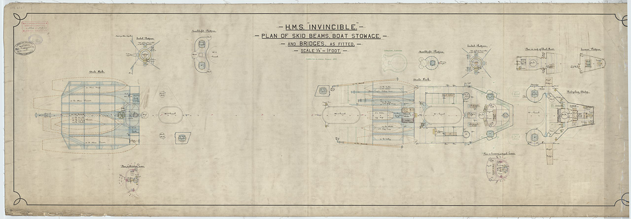 HMS Invincible (1907). Scale 1:48. A plan showing the skid beams [boat stowage] and bridges of the battlecruiser HMS Invincible (1914). The drawing shows her as completed in 1909, with subsequent alterations up to 1914.