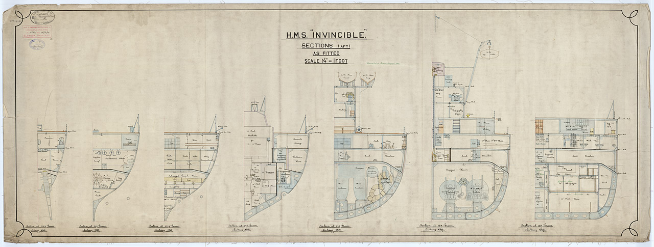 HMS Invincible (1907). Scale 1:48. A plan showing the after sections of the battlecruiser HMS Invincible (1914). The drawing shows her as completed in 1909, with subsequent alterations up to 1914.