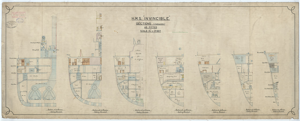 HMS Invincible (1907). Scale 1:48. A plan showing the forward sections of the battlecruiser HMS Invincible (1907). The drawing shows her as completed in 1909, with subsequent alterations up to 1914.