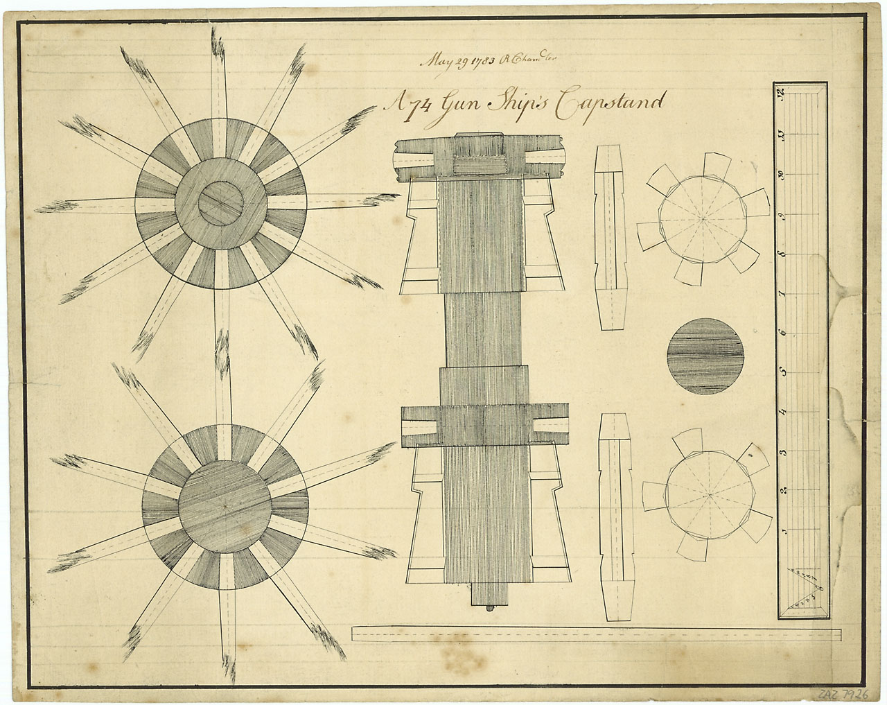 Capstan for 74-gun Third Rate, two-dec ker warships.. Scale: 1:16.  Plan showing the sections, plans and elevations for a large capstan for 74-gun Third Rate, two-decker warships.