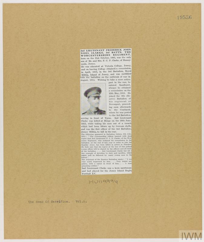 Second Lieutenant Frederick John Noel Clarke. Unit: 6th Battalion, attached to 3rd Battalion, Worcestershire Regiment. Death: 29 June 1915 Killed in action Age 19 years Western Front, Hooge