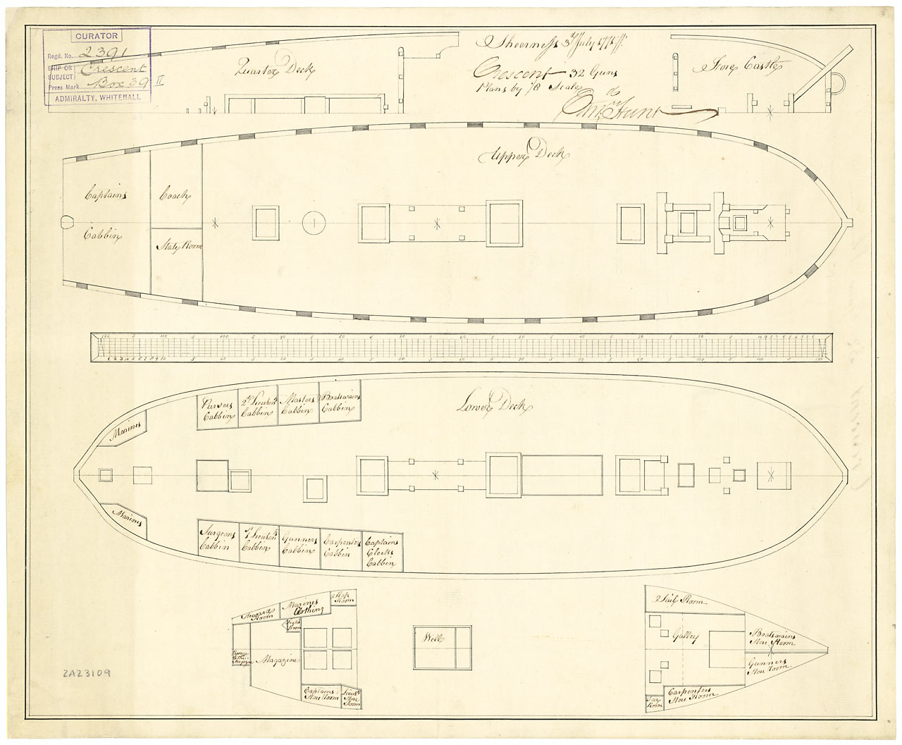 Crescent (captured 1758). Scale: 1:96. Plan showing the half-breadth for quarter deck and forecastle, upper deck, lower deck, and fore & aft platforms for Crescent (1759), a captured French Frigate, as taken off/fitted as a 32-gun, Fifth Rate Frigate