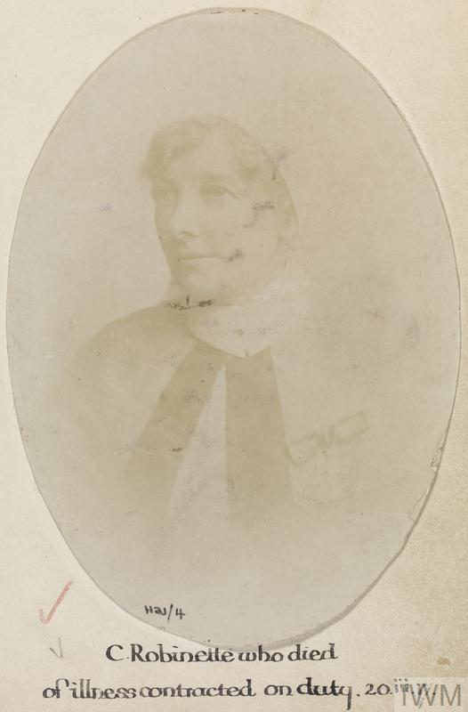 Staff Nurse Caroline A Robinette, Queen Alexandra's Imperial Military Nursing Service Reserve. Died of illness contracted on duty 30 March 1917.