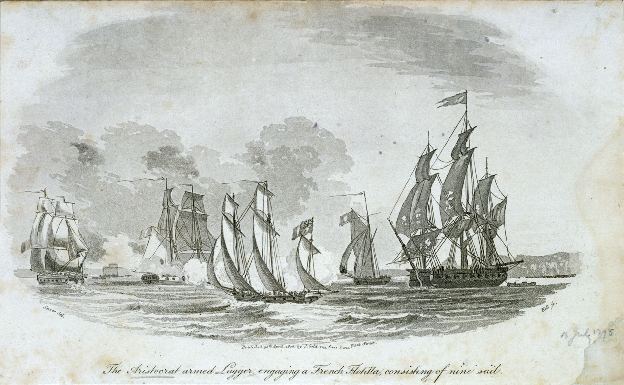 The Aristocrat armed Lugger engaging a French Flotilla, consisting of nine sail. Vignette from the 'Naval Chronicle'.