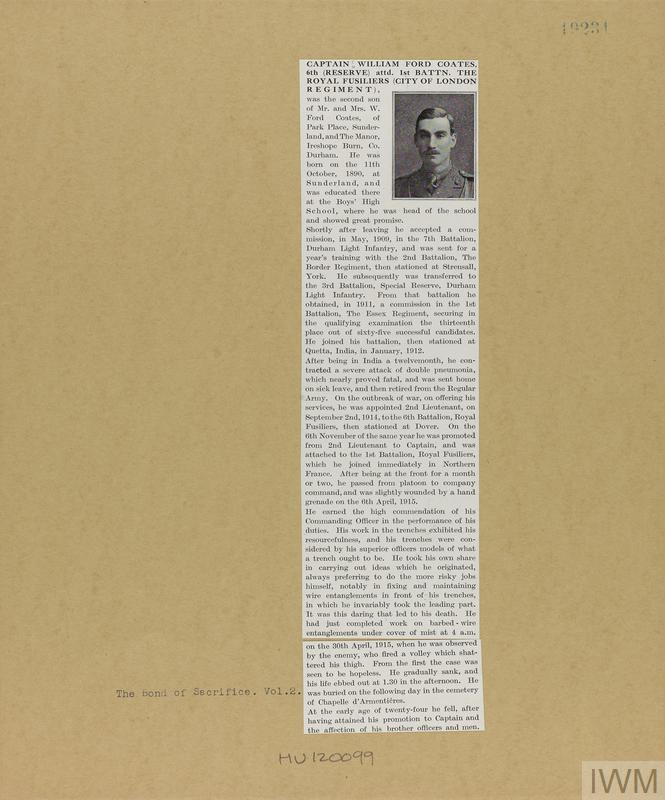 Captain William Ford Coates. Unit: 6th Battalion, attached to 1st Battalion, Royal Fusiliers. Death: 30 April 1915 Died of wounds Western Front