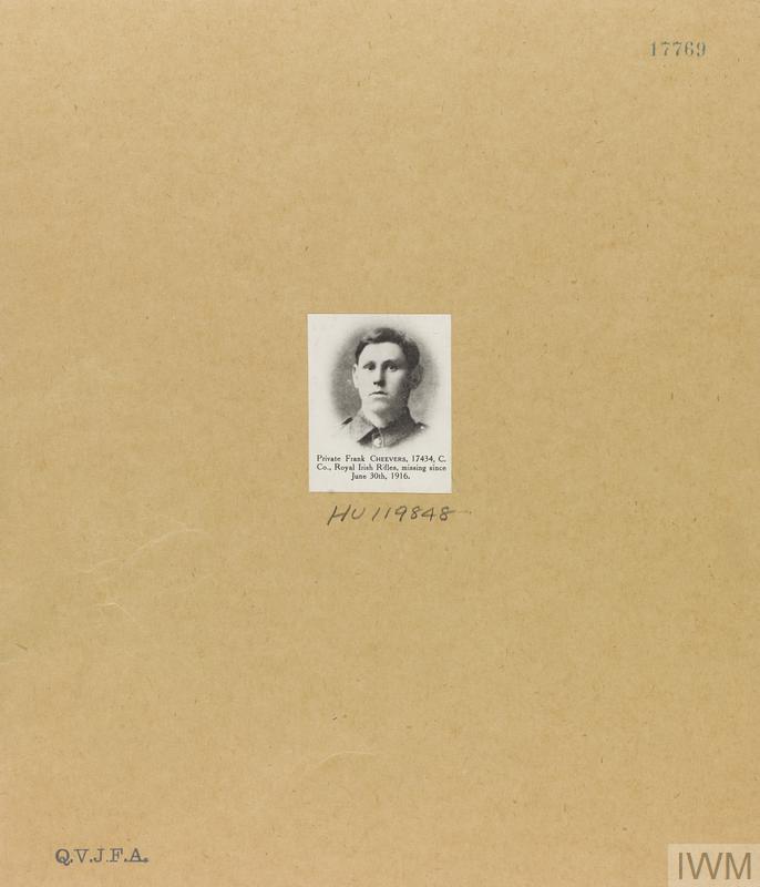 Private Francis Cheevers 17434. Unit: C Company, 13th Battalion, Royal Irish Rifles. Death: 30 June 1916 Missing in action. Son of John and Sarah Cheevers, of Killyleagh, Co. Down.
