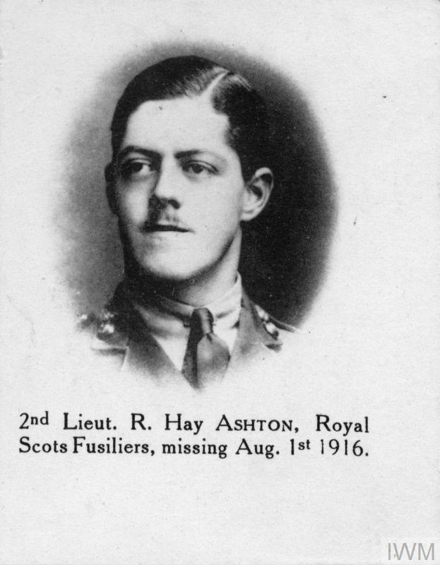 Second Lieutenant Roger Hay Ashton. Unit: 2nd Battalion, Royal Scots Fusiliers. Death: 30 July 1916, missing, Somme, Western Front. Commemorated on the Thiepval Memorial.