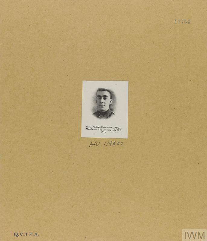 Private William Carruthers 32533. Unit: 18th Battalion, Manchester Regiment. Death: 30 July 1916, missing in action, Somme, Western Front. Commemorated on the Thiepval Memorial.