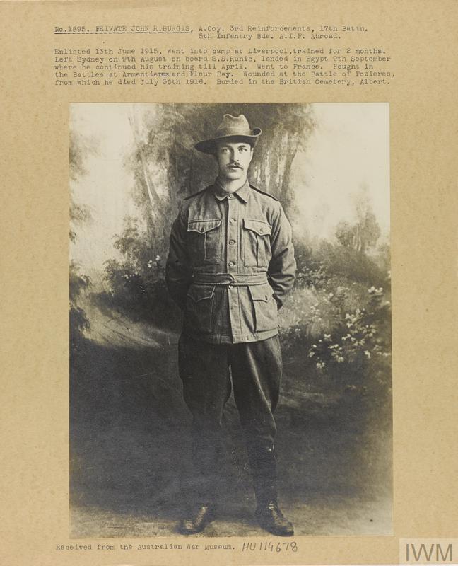 Private John Robert Burgis 1895. Unit: "A" Company, 17th Battalion, 5th Infantry Brigade, Australian Infantry, 3rd Reinforcements, Australian Imperial Force. Death: 30 July 1916, died from wounds received at Pozieres, Somme, Western Front.