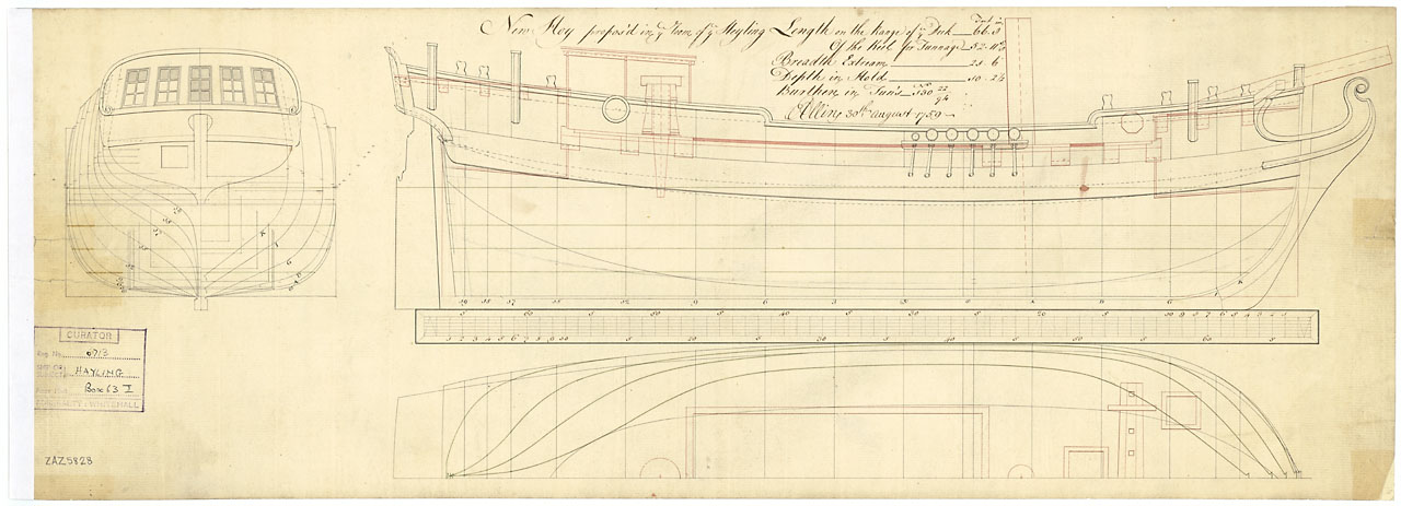 'Hayling' (1760). Scale: 1:48.  A plan showing the body plan with stern board outline, sheer lines with inboard detail and scroll head, and longitudinal half-breadth proposed for 'Hayling' (1760), a single-masted sixty-six foot timber
