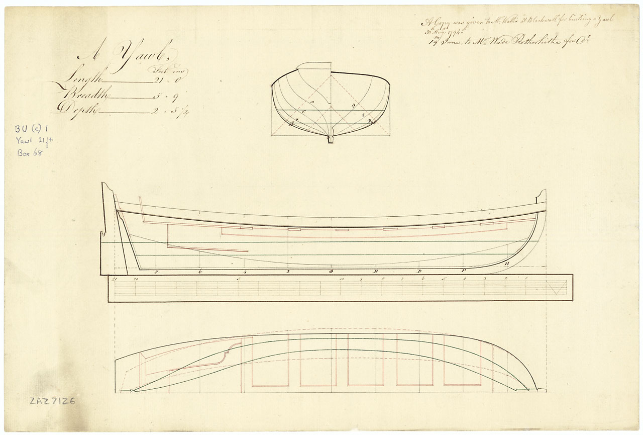 21 ft Yawl. Scale: 1:24.  Plan showing the body plan, sheer lines with inboard detail, and longitudinal half-breadth with inboard detail for a 21 ft Yawl.