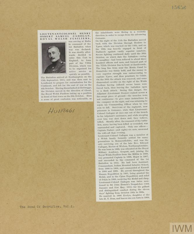 Lieutenant Colonel Henry Osbert Samuel Cadogan MID. Unit: Commanding 1st Battalion, Royal Welsh Fusiliers. Death: 30 October 1914 Killed in action near Ypres Western Front