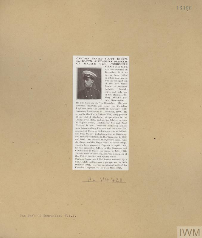Captain Ernest Scott Broun. Unit: 2nd Battalion, Yorkshire Regiment. Death: 30 October 1914 near Ypres Western Front. Son of the late James Broun. Former A.D.C. to the Govenor of Barbadoes.
