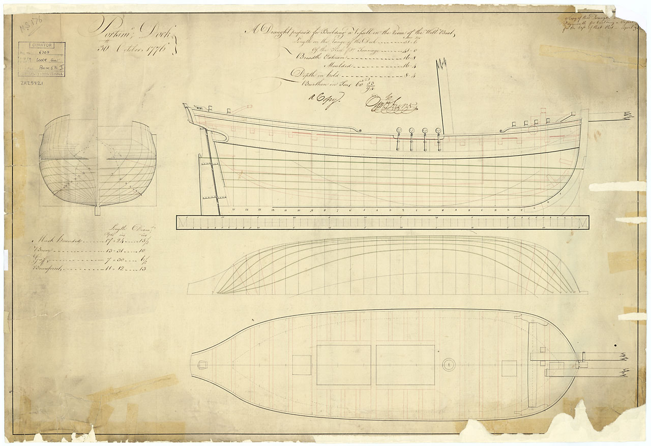 51ft Well Boat (1777). Scale: 1:38.4. A plan showing the body plan, sheer lines with some inboard detail, longitudinal half-breadth, and deck plan for a proposed single-masted fifty-one foot well boat (1777). A copy was sent to Plymouth Dockyard in 1777 f