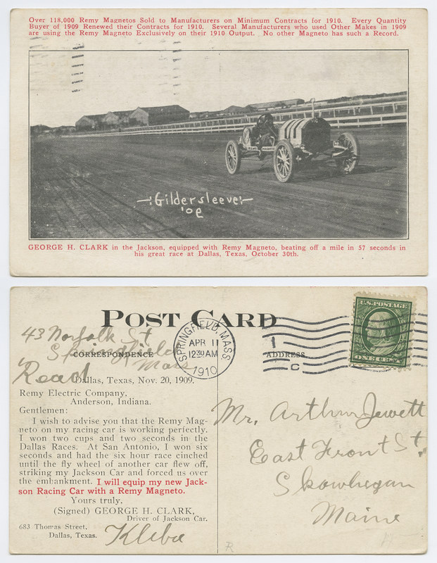 George H. Clark in the Jackson, equipped with Remy Magneto, beating off a mile in 57 seconds in his great race at Dallas, Texas, October 30th.